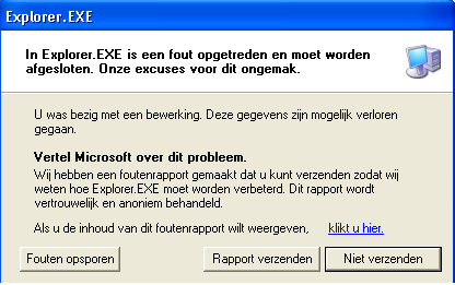Als ik op configuratiescherm klik krijg ik eerst de foutmelding dat er in explorer een foutmelding is gekomen en moet worden afgesloten. Als ik hierna op configuratiescherm klik gebeurt er niets. Dit heb ik ook in de map met mijn liedjes als ik alles selecteer en dan ctrl+c druk of rechtermuisknop druk en kopieren krijg ik ook die foutmelding -