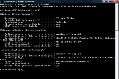 Ik heb mijn laptop nu geformatteerd. Nu is alles proper. Maar ik heb nog altijd geen internet verbinding, Als ik op verbinding maken druk bij start menu dan kan hij geen netwerken vinden. Ik heb ook bij netwerkcentrum netwerkdetectie ingeschakeld. In de bijlage zie je een foto van alle ip-adressen. -