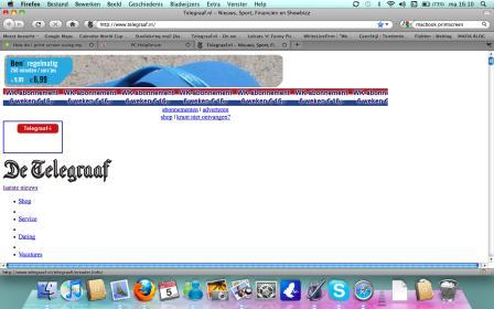 3. Hai allen, Ik heb een probleem en weet niet hoe ik het op moet lossen. Veel pagina's laden niet helemaal. Hierdoor werken knoppen niet en wordt de boel onoverzichtelijk. Ik weet eigenlijk bijna zeker dat het niet aan mijn internet ligt, omdat ik op een andere laptop er geen last van heb.. Ik heb hier een voorbeeldplaatje ( hoe krijg ik die in het forum?) van mijn telegraaf website. Het is niet altijd zo, maar vaak wel. De letters zijn dan in times new roman geschreven en alles staat onder elkaar (plaatjes, teksten, kopjes etc.). Weet iemand hoe dat komt? Groetjes, Nina