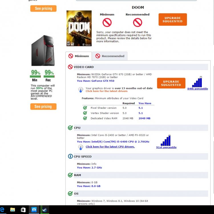 Op can u run it kan je zien of je pc aan de minimum vereisten voldoet om een spel te spelen. Ik heb getest op de nieuwe doom maar versta toch niet waarom ik geen minimum veresiten haal. Zie foto in bijlage: Iemand een antwoord of kan ik het toch spelen?