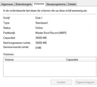 16. via apparaatbeheer vind de pc de 2 schijven wel alleen snap ik dit even niet goed van "niet toegewezen ruimte" bij de 1 '7mb' en de schijf die ik niet vind alles zie foto