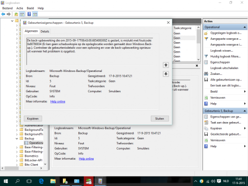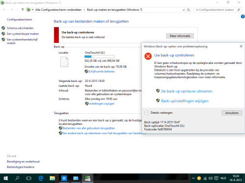 Goede morgen Ik heb een externe schijf waarop noig veel ruimte vrij is en ik ging in windows 10 eens kijken hoe het werkt met back up maken. Zoals ik het e.e.a zie is er nooit een backup gemaakt (zie bijgevoegde screenplaatje) en als ik een backup wil maken staat hij lang te stampen maar vlak voor het einde krijg ik een foutcode. Wat doe ik fout? Alvast bedankt voor uw hulp mvg