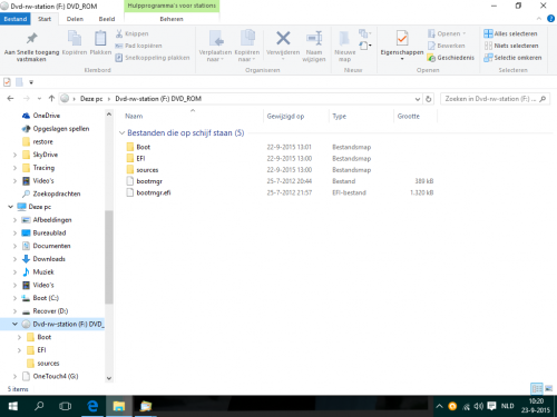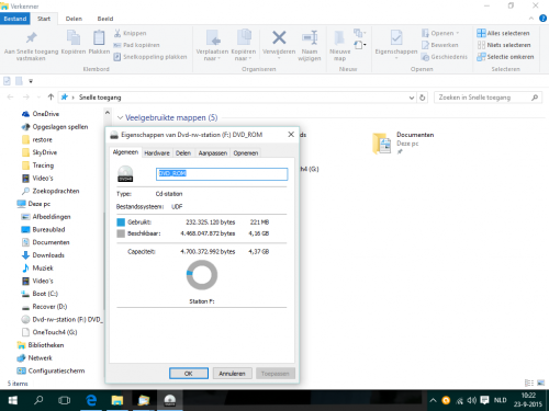 Beste Passer Ik geloof dat het gelukt is. In eerste instantie gaf hij aan dat het mislukt was en ik kon software (microsoft) zoeken op internet door op ok te drukken. Dat heb ik gedaan en na een minuut of 10 is er een DVD volgebrand. zie de 2 schermprintjes Als ik nu de schijf er in doen en ik druk snel op eigenschappen dan zie ik dat de DVD van 4,7 GB een vrije ruimte heeft van 0 dus helemaal volgeschreven. Dat is wel erg toevallig! Is het misschien zo dat het programma hem altijd vol schrijft om te voorkomen dat er nog iets anders bijgezet wordt? Kan ik die DVD er gewoon in dan kijken wat er allemaal op staat of gaat hij dan daad werkelijk rebooten of zoiets?