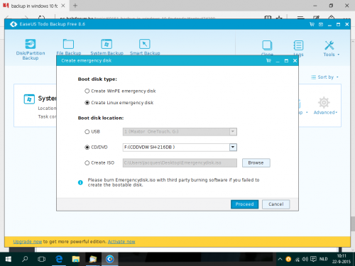 Beste Passer, Bedankt voor de info. Even ter controle inz. die rescuedisk. Dat zit toch in het EasUs programma onder "Create WinPe emergency disk? Als ik dan CD/DVD aanklik en er een schijf in doe gaat het allemaal toch vanzelf? Het klinkt misschien een beetje dom maar ik ben van '''''zekerheid eerst'''''' Bedankt allemaal