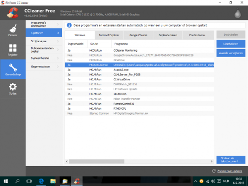 Beste Asus, Sorry, maar het is nog onduidelijk voor me. Als ik het e.e.a. lees dan staat er o.a. dat een clean boot ook bv virusscanners uitschakelt (Ik heb avast) Ik heb via CCleaner een printje gemaakt van mijn start-up programma's en bijgevoegd. a) als ik een clean boot doe moet ik dan avast niet daarna weer inschakelen? Ik denk dat ik geen effect van de clean boot kan meedelen omdat het e.e.a (timeout van wachtbewerking) weinig gebeurt Ik denk dat het juli was toen ik de voorlaatste melding kreeg c) Als je naar de print kijkt zie je 1 regel die begint met HKCU:RunOnce (One Drive item). Ik heb er een paar keer op geklikt en weet niet meer of die nu ingeschakeld of uitgeschakeld stond. Ik gebruik OneDrive niet. Moet ik hem in of uitschakelen of zelfs verwijderen. Alvast bedankt voor je antwoord