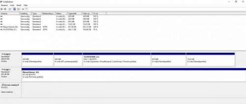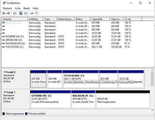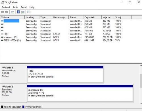 opnieuw printscreen gemaakt van schijfbeheer de memorex schijf wordt blijkbaar niet herkend, staat ook beetje lawaai te maken de western digital terug in orde gekregen -