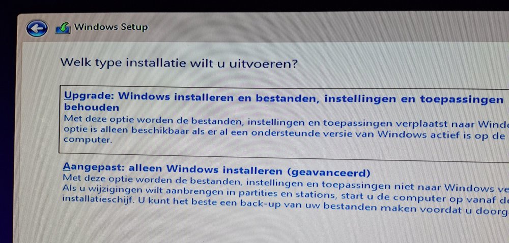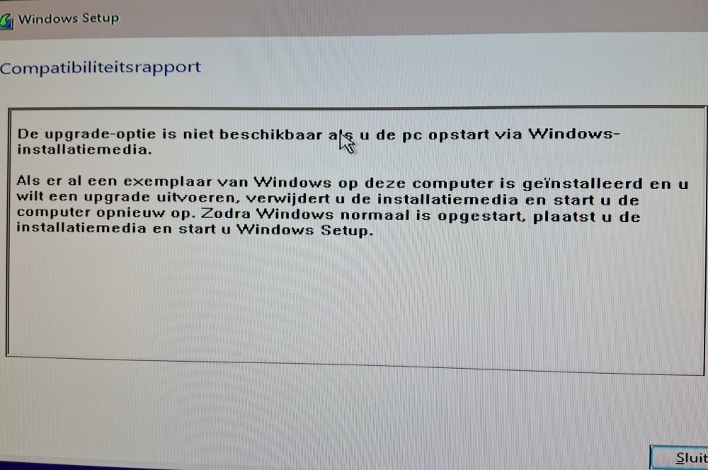 De USB stick zit in de probleem pc PC start op Ik kom in: Windows Setup Vraagt naar taal en toetsenbord (dat is duidelijk) Dan zie ik: Nu installeren Setup wordt gestart Ik krijg achtereenvolgens de volgende mededelingen: zie foto's Kies ik de eerste optie van foto1 dan krijg ik foto 2 te zien Kies ik de tweede optie van foto1 dan krijg ik foto3 te zien