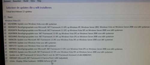 Geen probleem. Had inmiddels een ServicePack 2 - 64bits gevonden en deze staat er nu op. Hij is nog een update aan het installeren, maar deze was niet echt noodzakelijk volgens de pc. Het schiet trouwens ook niet op. KB982670 Microsoft.NET Framework 4 Client voor Windows Vista -