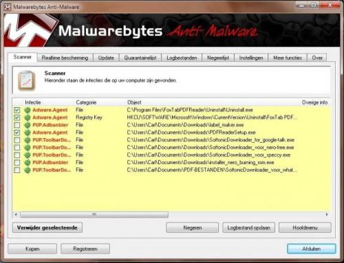 Hallo Clarkie, Doordat ik in het buitenland ben geweest, heb ik een tijdje niet achter de pc gezeten, vandaar dat ik nu pas reageer. Eerst mijn Hijack Logh, die ik vandaag heb gemaakt, daarna de Malwarebytes log, eveneens van vandaag. Vriendelijke groet, Ad Bammens. Logfile of Trend Micro HijackThis v2.0.4 Scan saved at 13:26:11, on 13-3-2012 Platform: Windows 7 (WinNT 6.00.3504) MSIE: Internet Explorer v8.00 (8.00.7600.16722) Boot mode: Normal Running processes: C:\Windows\system32\taskhost.exe C:\Program Files\Norton Internet Security\Engine\18.7.0.13\ccSvcHst.exe C:\Windows\system32\Dwm.exe C:\Windows\Explorer.EXE C:\Program Files\Wave Systems Corp\Services Manager\DocMgr\bin\WavXDocMgr.exe C:\Program Files\Wave Systems Corp\SecureUpgrade.exe C:\Program Files\Realtek\Audio\HDA\RtHDVCpl.exe C:\Program Files\CyberLink\PowerDVD8\PDVD8Serv.exe C:\Program Files\NewTech Infosystems\Acer Backup Manager\BackupManagerTray.exe C:\Program Files\Acer\Acer SmartBoot\ASLTray.exe C:\Program Files\Acer\Acer PowerSaver\PowerSaverTray.exe C:\Program Files\Epson Software\Event Manager\EEventManager.exe C:\Program Files\Real\RealPlayer\realplay.exe C:\Program Files\Common Files\Logitech\QCDriver3\LVComS.exe C:\Program Files\Common Files\Adobe\ARM\1.0\AdobeARM.exe C:\Program Files\Common Files\Java\Java Update\jusched.exe C:\Windows\System32\igfxtray.exe C:\Windows\System32\hkcmd.exe C:\Windows\System32\igfxpers.exe C:\Program Files\Freecorder\FLVSrvc.exe C:\Program Files\Common Files\Corel\Corel PhotoDownloader\Corel Photo Downloader.exe C:\Program Files\VoipBuster.com\VoipBuster\voipbuster.exe C:\Program Files\Windows Sidebar\sidebar.exe C:\Program Files\MSGTAG\MSGTAG.exe C:\Program Files\Ralink\Common\RaUI.exe C:\Program Files\Windows Live\Mail\wlmail.exe C:\Program Files\Windows Live\Contacts\wlcomm.exe C:\Windows\system32\wuauclt.exe C:\Windows\system32\SearchFilterHost.exe C:\Program Files\Trend Micro\HiJackThis\HiJackThis.exe R1 - HKCU\Software\Microsoft\Internet Explorer\Main,Search Bar = Preserve R0 - HKCU\Software\Microsoft\Internet Explorer\Main,Start Page = Google R1 - HKLM\Software\Microsoft\Internet Explorer\Main,Default_Page_URL = Hotmail, Messenger, nieuws en entertainment vind je op MSN.nl R1 - HKLM\Software\Microsoft\Internet Explorer\Main,Default_Search_URL = Bing R1 - HKLM\Software\Microsoft\Internet Explorer\Main,Search Page = Bing R0 - HKLM\Software\Microsoft\Internet Explorer\Main,Start Page = iGoogle Redirect R3 - URLSearchHook: Freecorder Toolbar - {1392b8d2-5c05-419f-a8f6-b9f15a596612} - C:\Program Files\Freecorder\prxtbFree.dll R3 - URLSearchHook: (no name) - {9427041a-a8dc-4d06-9a68-93873486e957} - (no file) O2 - BHO: Freecorder - {1392b8d2-5c05-419f-a8f6-b9f15a596612} - C:\Program Files\Freecorder\prxtbFree.dll O2 - BHO: AcroIEHelperStub - {18DF081C-E8AD-4283-A596-FA578C2EBDC3} - C:\Program Files\Common Files\Adobe\Acrobat\ActiveX\AcroIEHelperShim.dll O2 - BHO: Symantec NCO BHO - {602ADB0E-4AFF-4217-8AA1-95DAC4DFA408} - C:\Program Files\Norton Internet Security\Engine\18.7.0.13\coIEPlg.dll O2 - BHO: Symantec Intrusion Prevention - {6D53EC84-6AAE-4787-AEEE-F4628F01010C} - C:\Program Files\Norton Internet Security\Engine\18.7.0.13\IPS\IPSBHO.DLL O2 - BHO: Windows Live ID Sign-in Helper - {9030D464-4C02-4ABF-8ECC-5164760863C6} - C:\Program Files\Common Files\Microsoft Shared\Windows Live\WindowsLiveLogin.dll O2 - BHO: Windows Live Messenger Companion Helper - {9FDDE16B-836F-4806-AB1F-1455CBEFF289} - C:\Program Files\Windows Live\Companion\companioncore.dll O2 - BHO: Google Toolbar Helper - {AA58ED58-01DD-4d91-8333-CF10577473F7} - C:\Program Files\Google\Google Toolbar\GoogleToolbar_32.dll O2 - BHO: Google Toolbar Notifier BHO - {AF69DE43-7D58-4638-B6FA-CE66B5AD205D} - C:\Program Files\Google\GoogleToolbarNotifier\5.7.7227.1100\swg.dll O2 - BHO: Java Plug-In 2 SSV Helper - {DBC80044-A445-435b-BC74-9C25C1C588A9} - C:\Program Files\Java\jre6\bin\jp2ssv.dll O3 - Toolbar: Norton Toolbar - {7FEBEFE3-6B19-4349-98D2-FFB09D4B49CA} - C:\Program Files\Norton Internet Security\Engine\18.7.0.13\coIEPlg.dll O3 - Toolbar: Google Toolbar - {2318C2B1-4965-11d4-9B18-009027A5CD4F} - C:\Program Files\Google\Google Toolbar\GoogleToolbar_32.dll O3 - Toolbar: Freecorder Toolbar - {1392b8d2-5c05-419f-a8f6-b9f15a596612} - C:\Program Files\Freecorder\prxtbFree.dll O4 - HKLM\..\Run: [WavXMgr] "C:\Program Files\Wave Systems Corp\Services Manager\Docmgr\bin\WavXDocMgr.exe" O4 - HKLM\..\Run: [secureUpgrade] "C:\Program Files\Wave Systems Corp\SecureUpgrade.exe" O4 - HKLM\..\Run: [RtHDVCpl] C:\Program Files\Realtek\Audio\HDA\RtHDVCpl.exe -s O4 - HKLM\..\Run: [RemoteControl8] "C:\Program Files\CyberLink\PowerDVD8\PDVD8Serv.exe" O4 - HKLM\..\Run: [NortonOnlineBackupReminder] "C:\Program Files\Symantec\Norton Online Backup\Activation\NobuActivation.exe" UNATTENDED O4 - HKLM\..\Run: [backupManagerTray] "C:\Program Files\NewTech Infosystems\Acer Backup Manager\BackupManagerTray.exe" -h -k O4 - HKLM\..\Run: [AutoLockProcess] C:\Program Files\Acer\Empowering Technology\eLock\autolockprocess\autolockprocess.exe O4 - HKLM\..\Run: [Acer SmartBoot] C:\Program Files\Acer\Acer SmartBoot\ASLTray.exe O4 - HKLM\..\Run: [Acer PowerSaver] C:\Program Files\Acer\Acer PowerSaver\PowerSaverTray.exe O4 - HKLM\..\Run: [EEventManager] "C:\Program Files\Epson Software\Event Manager\EEventManager.exe" O4 - HKLM\..\Run: [RealTray] C:\Program Files\Real\RealPlayer\RealPlay.exe SYSTEMBOOTHIDEPLAYER O4 - HKLM\..\Run: [LVCOMS] C:\Program Files\Common Files\Logitech\QCDriver3\LVCOMS.EXE O4 - HKLM\..\Run: [LifeCam] "C:\Program Files\Microsoft LifeCam\LifeExp.exe" O4 - HKLM\..\Run: [Adobe ARM] "C:\Program Files\Common Files\Adobe\ARM\1.0\AdobeARM.exe" O4 - HKLM\..\Run: [APSDaemon] "C:\Program Files\Common Files\Apple\Apple Application Support\APSDaemon.exe" O4 - HKLM\..\Run: [QuickTime Task] "C:\Program Files\QuickTime\qttask.exe" -atboottime O4 - HKLM\..\Run: [sunJavaUpdateSched] "C:\Program Files\Common Files\Java\Java Update\jusched.exe" O4 