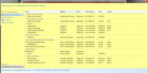 Stegisoft, hier is de logfile. Logfile of Trend Micro HijackThis v2.0.4 Scan saved at 11:45:21, on 10-12-2010 Platform: Windows 7 (WinNT 6.00.3504) MSIE: Internet Explorer v8.00 (8.00.7600.16671) Boot mode: Normal Running processes: C:\Windows\system32\taskhost.exe C:\Windows\system32\Dwm.exe C:\Windows\Explorer.EXE C:\Program Files\Wave Systems Corp\Services Manager\DocMgr\bin\WavXDocMgr.exe C:\Program Files\Wave Systems Corp\SecureUpgrade.exe C:\Program Files\Realtek\Audio\HDA\RtHDVCpl.exe C:\Program Files\CyberLink\PowerDVD8\PDVD8Serv.exe C:\Windows\System32\igfxpers.exe C:\Program Files\ScanSoft\OmniPageSE4\OpWareSE4.exe C:\Windows\System32\igfxtray.exe C:\Windows\System32\hkcmd.exe C:\Program Files\Canon\MyPrinter\BJMYPRT.EXE C:\Program Files\NewTech Infosystems\Acer Backup Manager\BackupManagerTray.exe C:\Program Files\Acer\Acer PowerSaver\PowerSaverTray.exe C:\Windows\system32\igfxsrvc.exe C:\Program Files\Google\GoogleToolbarNotifier\GoogleToolbarNotifier.exe C:\Program Files\VoipBuster.com\VoipBuster\VoipBuster.exe C:\Program Files\Logitech\Vid HD\Vid.exe C:\Windows\system32\wuauclt.exe C:\Program Files\Trend Micro\HiJackThis\HiJackThis.exe R1 - HKCU\Software\Microsoft\Internet Explorer\Main,Default_Page_URL = iGoogle Redirect R1 - HKCU\Software\Microsoft\Internet Explorer\Main,Search Page = Bing R0 - HKCU\Software\Microsoft\Internet Explorer\Main,Start Page = Google R1 - HKLM\Software\Microsoft\Internet Explorer\Main,Default_Page_URL = iGoogle Redirect R1 - HKLM\Software\Microsoft\Internet Explorer\Main,Default_Search_URL = Bing R1 - HKLM\Software\Microsoft\Internet Explorer\Main,Search Page = Bing R0 - HKLM\Software\Microsoft\Internet Explorer\Main,Start Page = iGoogle Redirect R0 - HKLM\Software\Microsoft\Internet Explorer\Search,SearchAssistant = R0 - HKLM\Software\Microsoft\Internet Explorer\Search,CustomizeSearch = R0 - HKCU\Software\Microsoft\Internet Explorer\Toolbar,LinksFolderName = R3 - URLSearchHook: ToolbarURLSearchHook Class - {CA3EB689-8F09-4026-AA10-B9534C691CE0} - C:\Program Files\InfraRecorder 0.51.0.0\tbhelper.dll O2 - BHO: AcroIEHelperStub - {18DF081C-E8AD-4283-A596-FA578C2EBDC3} - C:\Program Files\Common Files\Adobe\Acrobat\ActiveX\AcroIEHelperShim.dll O2 - BHO: (no name) - {5C255C8A-E604-49b4-9D64-90988571CECB} - (no file) O2 - BHO: Symantec NCO BHO - {602ADB0E-4AFF-4217-8AA1-95DAC4DFA408} - C:\Program Files\Norton Internet Security\Engine\18.1.0.37\coIEPlg.dll O2 - BHO: Symantec Intrusion Prevention - {6D53EC84-6AAE-4787-AEEE-F4628F01010C} - C:\Program Files\Norton Internet Security\Engine\18.1.0.37\IPSBHO.DLL O2 - BHO: Google Toolbar Helper - {AA58ED58-01DD-4d91-8333-CF10577473F7} - C:\Program Files\Google\Google Toolbar\GoogleToolbar_32.dll O2 - BHO: Google Toolbar Notifier BHO - {AF69DE43-7D58-4638-B6FA-CE66B5AD205D} - C:\Program Files\Google\GoogleToolbarNotifier\5.6.5805.1910\swg.dll O2 - BHO: TBSB07458 - {FCBCCB87-9224-4B8D-B117-F56D924BEB18} - C:\Program Files\InfraRecorder 0.51.0.0\tbcore3.dll O3 - Toolbar: Google Toolbar - {2318C2B1-4965-11d4-9B18-009027A5CD4F} - C:\Program Files\Google\Google Toolbar\GoogleToolbar_32.dll O3 - Toolbar: Free software Gooofull toolbar - {C86FF9FA-AEED-451B-A9CC-39A53173AE2E} - C:\Program Files\InfraRecorder 0.51.0.0\tbcore3.dll O3 - Toolbar: Norton Toolbar - {7FEBEFE3-6B19-4349-98D2-FFB09D4B49CA} - C:\Program Files\Norton Internet Security\Engine\18.1.0.37\coIEPlg.dll O4 - HKLM\..\Run: [WavXMgr] "C:\Program Files\Wave Systems Corp\Services Manager\Docmgr\bin\WavXDocMgr.exe" O4 - HKLM\..\Run: [sSBkgdUpdate] "C:\Program Files\Common Files\Scansoft Shared\SSBkgdUpdate\SSBkgdupdate.exe" -Embedding -boot O4 - HKLM\..\Run: [secureUpgrade] "C:\Program Files\Wave Systems Corp\SecureUpgrade.exe" O4 - HKLM\..\Run: [RtHDVCpl] C:\Program Files\Realtek\Audio\HDA\RtHDVCpl.exe -s O4 - HKLM\..\Run: [RemoteControl8] "C:\Program Files\CyberLink\PowerDVD8\PDVD8Serv.exe" O4 - HKLM\..\Run: [Persistence] C:\Windows\system32\igfxpers.exe O4 - HKLM\..\Run: [OpwareSE4] "C:\Program Files\ScanSoft\OmniPageSE4\OpwareSE4.exe" O4 - HKLM\..\Run: [NortonOnlineBackupReminder] "C:\Program Files\Symantec\Norton Online Backup\Activation\NobuActivation.exe" UNATTENDED O4 - HKLM\..\Run: [igfxTray] C:\Windows\system32\igfxtray.exe O4 - HKLM\..\Run: [HotKeysCmds] C:\Windows\system32\hkcmd.exe O4 - HKLM\..\Run: [EmbassySecurityCheck] ";C:\Program Files\Wave Systems Corp\EMBASSY Security Setup\EMBASSYSecurityCheck.exe" O4 - HKLM\..\Run: [CanonSolutionMenu] C:\Program Files\Canon\SolutionMenu\CNSLMAIN.exe /logon O4 - HKLM\..\Run: [CanonMyPrinter] C:\Program Files\Canon\MyPrinter\BJMyPrt.exe /logon O4 - HKLM\..\Run: [backupManagerTray] "C:\Program Files\NewTech Infosystems\Acer Backup Manager\BackupManagerTray.exe" -h -k O4 - HKLM\..\Run: [AutoLockProcess] C:\Program Files\Acer\Empowering Technology\eLock\autolockprocess\autolockprocess.exe O4 - HKLM\..\Run: [Adobe Reader Speed Launcher] "C:\Program Files\Adobe\Reader 9.0\Reader\Reader_sl.exe" O4 - HKLM\..\Run: [Acer SmartBoot] C:\Program Files\Acer\Acer SmartBoot\ASLTray.exe O4 - HKLM\..\Run: [Acer PowerSaver] C:\Program Files\Acer\Acer PowerSaver\PowerSaverTray.exe O4 - HKCU\..\Run: [swg] "C:\Program Files\Google\GoogleToolbarNotifier\GoogleToolbarNotifier.exe" O4 - HKCU\..\Run: [VoipBuster] "C:\Program Files\VoipBuster.com\VoipBuster\VoipBuster.exe" -nosplash -minimized O4 - HKCU\..\Run: [Logitech Vid] "C:\Program Files\Logitech\Vid HD\Vid.exe" -bootmode O8 - Extra context menu item: E&xport to Microsoft Excel - res://C:\PROGRA~1\MICROS~1\Office12\EXCEL.EXE/3000 O8 - Extra context menu item: E&xporteren naar Microsoft Excel - res://C:\PROGRA~1\MICROS~1\OFFICE11\EXCEL.EXE/3000 O8 - Extra context menu item: Google Sidewiki... - res://C:\Program Files\Google\Google Toolbar\Component\GoogleToolbarDynamic_mui_en_950DF09FAB501E03.dll/cmsidewiki.html O9 - Extra button: Onderzoek - {92780B25-18CC-41C8-B9BE-3C9C571A8263} - C:\PROGRA~1\MICROS~1\OFFICE11\REFIEBAR.DLL O9 - Extra button: Free software Gooofull toolbar 