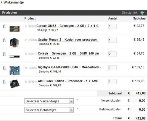 20. Uiteindelijk bestelt : Werkgeheugen : Corsair XMS3 - Geheugen - 2 GB ( 2 x 1 GB ) - DIMM 240-pins - DDR3 - 1333 MHz / PC3-10600 - CL9 - niet-gebufferd Corsair XMS3 - Geheugen - 4 GB ( 2 x 2 GB ) - DIMM 240-pins - DDR3 - 1333 MHz / PC3-10666 - CL9 - 1.5 V Moederbord : Gigabyte GA-MA790XT-UD4P - Moederbord - ATX - AMD 790X - Socket AM3 - UDMA133, Serial ATA-300 (RAID) - Gigabit Ethernet - FireWi Processor : AMD Black Edition - Processor - 1 x AMD Phenom II X4 955 / 3.2 GHz - Socket AM3 - L3 6 MB - Box Koeler : Scythe Mugen 2 - Koeler voor processor - ( Socket 1366, Socket 775, Socket 754, Socket 939, Socket 940, Socket AM2, Socket AM2+ Totaal prijs : € 422,84