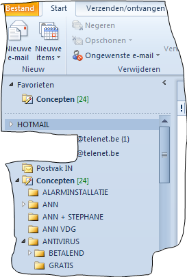 Dank Clarkie voor de nuttige tips i.v.m. het knipprogramma. Misschien is het nuttig even mijn probleem opnieuw te situeren. Ik heb op aanraden van Telenet mijn oude account … @telenet.be vervangen omdat outlook 2010 geweldig traag was geworden en zelfs dikwijls niet meer opstartte. Ik kreeg heel vaak het bericht “ MS Outlook reageert niet”. Een nieuwe account … @telenet.be(1) werd aangemaakt. Ik moet trouwens vaststellen dat ik (eigenaardig genoeg ?) met mijn andere accounts (hotmail en gmail) in outlook geen enkel probleem heb. Zoals de knipsels hieronder aangeven staan onder de oude account …@telenet.be de klassieke items. Onder “Concepten” staan dan mijn verschillende mappen met submappen , zoals bv. de map ANTIVIRUS met de submappen “betalend” en “gratis”. Ik heb de verschillende items (emails in postvak-in/verzonden items/verwijderde items/etc.) van mijn oude account grondig opgekuist en heb de overblijvende te bewaren mails kunnen slepen naar de nieuwe account @telenet.be(1). Tot daar is alles dus in orde. In mijn FAVORIETEN (zie knipsel 3 hierboven) staan nu mijn CONCEPTEN en ik zou er tevens ook mijn gele (SUB)MAPPEN willen onderbrengen ervan uitgaand dat ik daar best de mails voor al mijn accounts (ook dus hotmail & gmail) kan klasseren. Voor de verplaatsing van mijn “concepten” is er geen probleem geweest : die kunnen inderdaad gemakkelijk naar “Favorieten” versleept worden. Idem voor de mappen die geen submappen bevatten maar het probleem voor mij is dat van zodra een map submappen bevat ik die submappen niet samen met de hoofdmap kan verslepen. Concreet : ik wil de volledige map “Antivirus” (samen dus met de 2 submappen) in één handeling verslepen naar “Favorieten” : ik zet de cursor op de map “Antivirus” en klik met de rechtermuisknop op die volledige map. Ik opteer dan in het begeleidend verschijnend venster voor de keuze “in favorieten weergeven”. Gevolg : de map “Antivirus” verhuist maar de submappen “betalend” en “gratis” komen niet mee … ! Hopelijk is alles zo klaarder en ken jij de methode om die mappen met submappen te verplaatsen. Hopelijk zijn ze zelfs allemaal samen te verplaatsen ? Nu maak ik me toch nog één bedenking : zoals ik reeds zei wens ik mijn oude account Telenet te verwijderen. Als ik erin slaag mijn Mappen (+ submappen) vanuit die oude account te verhuizen naar “Favorieten” en ik die oude account dan verwijder, gaan die mappen daar dan zonder risico van verdwijning (samen met de oude account) aldaar behouden kunnen worden ? -