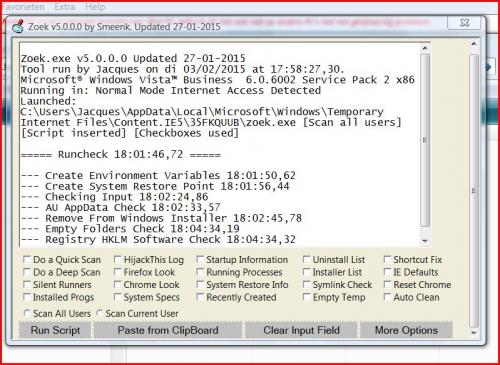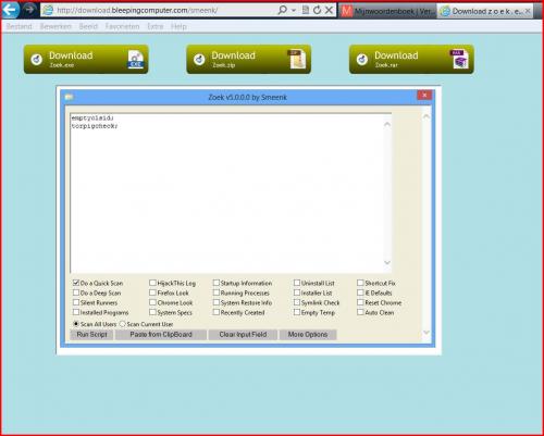 Er loopt waarschijnlijk iets mis met het downloaden van zoek.exe. In ieder geval, meer dan de twee logjes die ik hier reeds in bijlage verstuurd heb kan ik niet maken. Het probleem lijkt voor mij te ingewikkeld om hier te kunnen oplossen. Sorry daarvoor en dank voor jullie moeite Vaes -