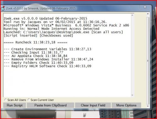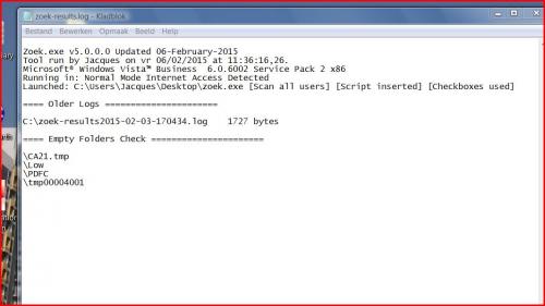 kweezie, ik probeer nogmaals stap voor stap. Ik heb begrepen dat ik in de eerste plaats een "zoek-ressults.log" moet verkrijgen. Volgens Uw instructies begin ik met het downloaden van zoek.exe. Als ik dat doe bekom ik als resultaat , zie bijlage "forum 01". Daar zou ik dan een script moeten in plakken: {8b337819-d1e.... enz..... KLopt dat ?? En wat dan met de gegevens die je daaronder plaatst ? C:\users\Jacques\AppData........... enz .... Wat moet ik daarmee ? Vaes -