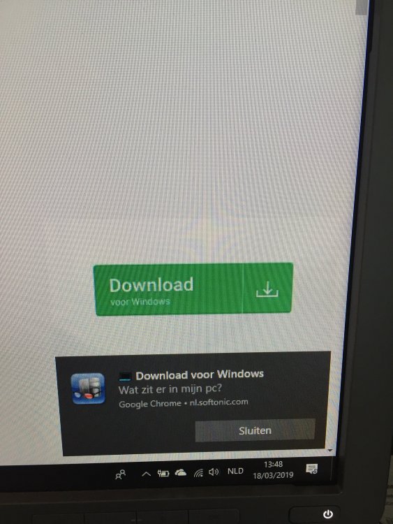 1. Hallo, hier ben ik terug, ik ben er blijkbaar toch niet van verlost... In bijlage een schermfoto zoals ik de melding krijg... In het klein staat er iets bij van nl.softonic.com en steeds dezelfde soort groene 'Download' icoon, Sorry maar t'is niet opgelost Dany