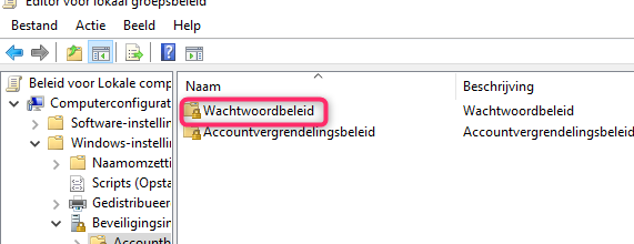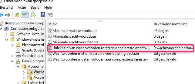 18. Het zou in Windows 10 Home ook moeten kunnen door de editor voor lokaal groepsbeleid te installeren. Heb het zelf nog nooit getest omdat ik de PRO versie gebruik. https://www.schoonepc.nl/optim/editor_lokaal_groepsbeleid.html Is bovenstaande gelukt? Typ dan in het zoeken venster naast je Windows knop : gpedit.msc en druk op de ENTER toets. Dan zou je onderstaand scherm krijgen. Ga er naar Computerconfiguratie-> Windows- Instellingen-> Beveiligingsinstellingen-> Accountbeleid. Open dan wachtwoordbeleid. Daar klik je op Uniekheid van wachtwoorden forceren door laatste wachtwoorden.....