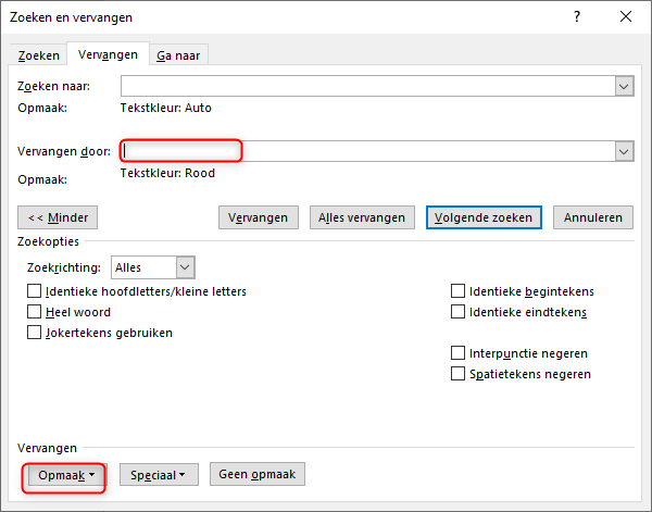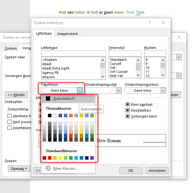 16. Via de vervangfunctie kan je laten zoeken op tekstkleur en deze kleur zonder alle woorden manueel te gaan zoeken en selecteren vervangen door een andere kleur. Via de toetsencombinatie ctrl- H of via de knop vervangen in Word bereik je deze functie. In het venster dat je dan krijgt klik je in het zoeken naar venster. Dan klik je op Opmaak. Dan lettertype. In het volgend venster selecteer je de tekstkleur. Als voorbeeld heb ik automatisch gekozen (zwart). Je ziet nu bij zoeken naar en dan bij opmaak tekstkleur: auto. Nu klik je in het vervangen door venster. Klik dan op Opmaak. Dan lettertype. Selecteer de gewenste kleur waarin de tekst moet veranderen. Ik heb Rood gekozen. Dan kan je via de knop Volgende zoeken de woorden zien waarvan de tekstkleur vervangen kan worden. Via de knop Vervangen en alles vervangen kan je de kleur wijzigen.