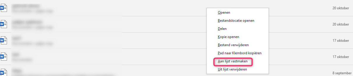 15. Ik neem aan dat je werkt met sjablonen? Dus een aangemaakt document dat je bewaart als start document. In dat document vul je iedere dag gegevens in en bewaar je onder een andere bestandsnaam? Je hebt niet vermeld met welke versie van office je werkt. In onderstaand voorbeeld gebruik ik Office 2019. Je kan in Office apps zoals o.a. Word en excel bestanden vastpinnen waardoor ze snel bereikbaar zijn. Ga in Word of Excel naar bestand. In het volgend venster zie je o.a. Recent en vastgemaakt. In recent vindt je de recent geopende documenten terug. In vastgemaakt de documenten die je vastgepind hebt. Wil je een document vastpinnen waardoor het snel bereikbaar is klik je op recent. Nu zie je een opsomming van recent geopende documenten. Ga je met de muisaanwijzer op zo'n bestand staan met de muisaanwijzer zie je een punaise. Klik er op en het document wordt vastgemaakt. Nu vindt je het document altijd terug bij vastgemaakt. Een tweede mogelijkheid is door in de lijst op het document met de rechtermuisknop te klikken. in het menu dat je dan krijgt kies je aan lijst vastmaken. Nu zie je dat er punaise staat achter het document, het is dus vastgemaakt. Wil je in de toekomst snel een document kunnen openen dat vastgemaakt is klik je op Vastgemaakt in je startpagina. Wil je de documenten snel benaderen via de verkenner klik dan eens op onderstaande link. https://haalmeeruitoffice.nl/snelle-toegang/