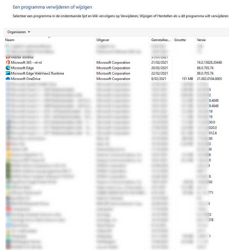 9. Op een nieuwe laptop staat vaak reeds een office versie, deze is meestal een probeerversie. Wat bedoel je met inloggen? Moet je via een browser inloggen of ....? Het zou dus maar goed kunnen dat je met 3 verschillende Office versies door elkaar aan het knoeien bent. Namelijk: 1. de testversie die vooraf misschien reeds op je laptop staat bij aankoop 2. een office versie 2019 3. office 365 Dus welke versie heb je nu als laatst aangekocht? Maak ook gebruik van printscreens en plaats die afbeeldingen in je bericht. Afbeeldingen zeggen vaak meer dan woorden. Typ in het zoeken venster configuratiescherm. en klik dan op Configuratiescherm. In het volgend scherm klik je op Programma's. Klik dan op een programma verwijderen. Maak een printscreen van het venster dat je dan krijgt met alle Microsoftware software in beeld zoals hieronder. Plaats die afbeelding in je volgend bericht.