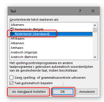 8. Indien de controle niet in het nederlands staat maar Engels dubbelklik dan in het word venster onderaan op het woord in jouw geval Engels. Nu krijg je volgend scherm. Kies er de gewenste standaardtaal en bevestig.