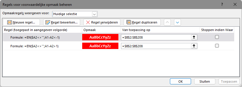 Klik 1 of meerdere cellen in kolom B aan. Ga dan naar start (1), Voorwaardelijke opmaak (2), Regels beheren (3) en klik erop. De formules zie je in volgend scherm staan Indien je het met formules niet lukt neem dan onderstaande eens door, is misschien ook goed genoeg voor jouw.