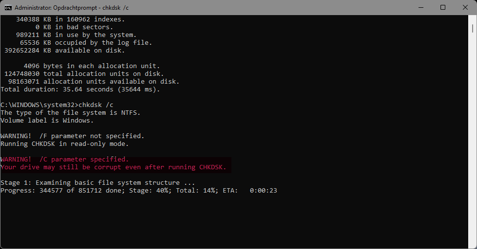Misschien even de verschillende mogelijkheden hieronder opsommen; @Passer De printscreens die jij toont gaan over het commando chkdsk. Als je dat uitvoert wordt er gescand maar NIET gerepareerd. Je blijft in het prompt scherm en je krijgt inderdaad een eindresultaat te zien. Het venster blijft ook aanwezig tot je het zelf afsluit. @Passer @Calvus Hier het scherm van het commando, chkdsk. Merk op dat er staat read-only. Je blijft altijd in je Windows scherm en er moet niet herstart worden. Scan is voltooid. Nu wordt er enkel de C gecontroleerd via het commando chkdsk /c Lees ook de tekst in het rood. Nu geef ik het commando in dat Calvus bedoelt. Scannen en repareren. chkdsk /r Nu moet er wel herstart worden om de bewerking te voltooien. Er wordt een voortgang getoond. Na het voltooien krijg je zoals Calvus terecht aangaf enkel even een tekst dat het proces voltooid is. Wil je het log achteraf nog nalezen kijk dan eens in volgende link: https://www.thewindowsclub.com/find-chkdsk-results-in-event-viewer-logs