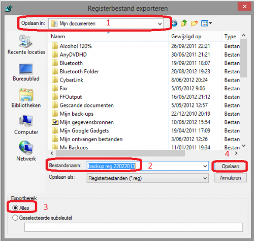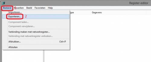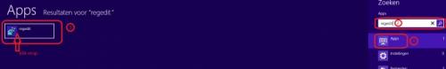 Volledige back-up maken van het register in Windows 8 Ga met de muis naar de rechter benedenhoek (langs de klok). De Charm balk verschijnt, klik er op zoeken. Het zoeken venster verschijnt. Klik op Apps en typ in het lege venster regedit. Aan de rechterkant verschijnt nu de App regedit, klik erop. Klik in het volgende venster op bestand (1) en op exporteren (2) Kies in het verkenner- venster de locatie waar je de back-up wil opslaan (1) Kies ook een bestandsnaam (2) Zet bij exportbereik een vinkje bij alles (3) Klik op opslaan (4)
