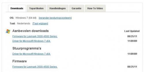 Via deze link kan je de driver downloaden, je moet nog enkel je Windows versie opgeven. Link apart per download: http://support.lexmark.com/index?page=content&id=DR21174&docLocale=nl_NL&segType=recommendedSegmentMICROSOFT http://support.lexmark.com/index?page=content&id=DR18874&docLocale=nl_NL&segType=recommendedSegmentMICROSOFT -