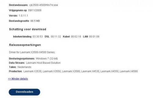 De driver is de juiste voor Windows 7. Gebruik je de printer draadloos? Verwijder alles van je Lexmark. Voer dan onderstaande uit: Download CCleaner. (Als je het nog niet hebt) Installeer het (Als je niet wil dat Google Chrome op je pc als standaard webbrowser wordt geïnstalleerd, moet je de 2 vinkjes wegdoen !!!) en start CCleaner op. Klik in de linkse kolom op “Cleaner”. Klik achtereenvolgens op ‘Analyseren’ en 'Schoonmaken'. Klik vervolgens in de linkse kolom op “Register” en klik op ‘Scan naar problemen”. Als er fouten gevonden worden klik je op ”Herstel geselecteerde problemen” en ”OK”. Dan krijg je de vraag om een back-up te maken. Klik op “JA”. Kies dan “Herstel alle geselecteerde fouten”. Soms is 1 analyse niet voldoende. Deze procedure mag je herhalen tot de analyse geen fouten meer aangeeft. Sluit hierna CCleaner terug af. Wil je dit uitgebreid in beeld bekijken, klik dan hier voor de handleiding. Volg eventueel de onderstaande handleiding voor de installatie van de printer. http://www.lexmark.com/publications/pdfs/2007/3500/v2104267_nl.pdf Ook kan je altijd via e-mail of Telefoon contact opnemen met Lexmark via deze link. -