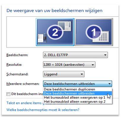 In de tekst uit link1 kom je op een gegeven moment onderstaande tegen, daar moet je instellen welke weergave dat je wil gebruiken. Wil je hetzelfde beeld op je tweede scherm kies je dupliceren. Wil je op het tweede scherm een ander beeld kunnen krijgen kies dan uitbreiden. Via de twee andere functies ( weergeven op 1, weergeven op 2) kies je op welk scherm je beeld wil.