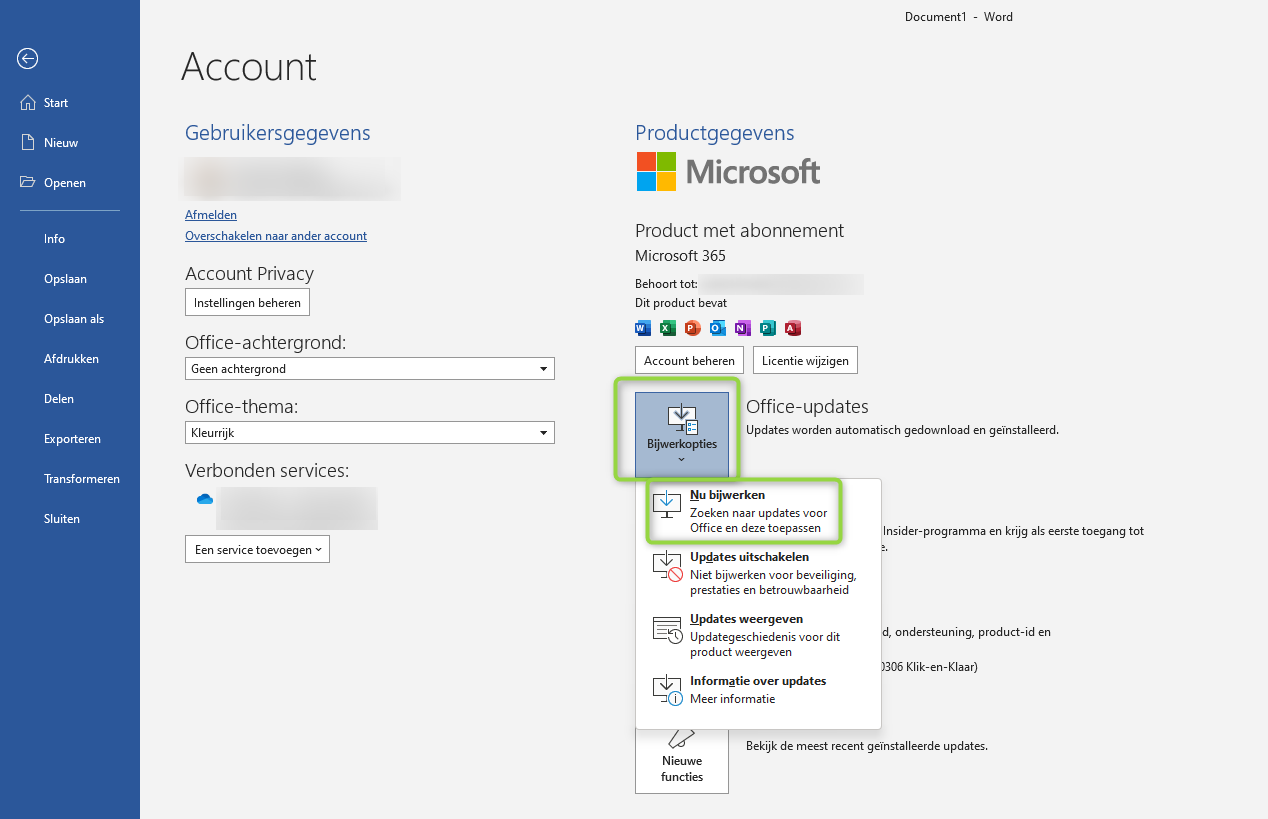 In jouw afbeeldingen valt te zien dat je de online versie gebruikt. abbs heeft het over Office die op je pc geïnstalleerd is. Daar ga je in Word naar bestand-> accounts.-> bijwerkopties. Het versienummer vindt je bij dan bij info voor Word.