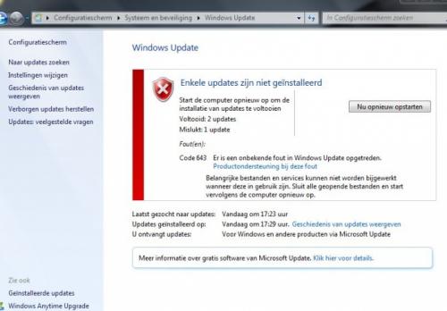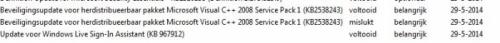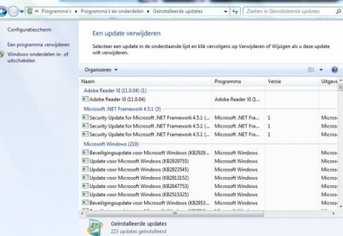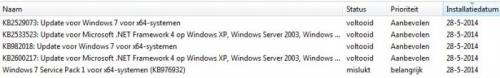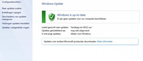 Guy, en Clarkie bedankt. Ik ga het proberen. Normaal doe ik dat ook via configuratie, beveiliging, dan update. Daar zag ik ook bij de geïnstalleerde update dat er problemen waren. Als ik zoek naar update geeft hij aan dat er geen updates meer zijn omdat de pc al up to date is. Als ik het goed begrijp moet ik nu naar de verborgen updates kijken. Zouden dan die mislukte en geannuleerde updates weer opnieuw aangeboden worden.? - - - Updated - - - Het programma geeft aan dat er ook geen verborgen updates zijn. Dus is er niets te herstellen. Toch raar dat de updates die mislukt zijn niet opnieuw worden aangeboden. -