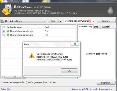 Hallo mensen, Ik heb een probleem met recuva. In het verleden werkte dit oke, nu krijg ik een melding dat de ruimte niet genoeg is. Ik wil alleen maar 1 of 2 email bestanden terughalen (zip). Terwijl er op 1 schijf nog 69 GB zit en de 3 anderen 49 GB De nieuwste update Chrasht en werkt niet