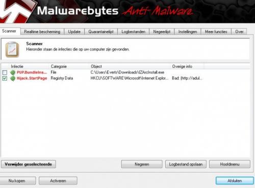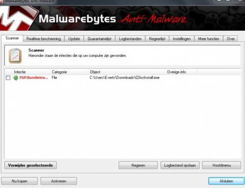Wel raar dat een installatie programma die virus heeft en het programma niet. Wat doe ik met die Cobofix bestanden/ programma en Hijjack files en programma. Waarom wilde de nieuwste HijjackThis niet installeren en moest ik deze oude versie gebruiken. Heeft deze virussen ook te maken met mijn accu. Vanochtend ging het maar tot 66 % en pats uit. Malwarebyte zet geen problemen meer, nadat ik uw opdracht de download van IZArc te verwijderen uit de map downloads. Daarna heb ik uit voorzorg de map prullenbak leeg gemaakt en opnieuw opgestart.