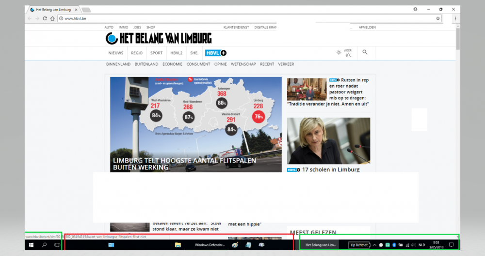 Telkens de laptop uit slaapstand komt (deksel openen) flikkert het rode deel een van de taakbalk. Dit "flikkeren" duurt ongeveer 45 minuten.....dan is alles terug normaal. Terug opstarten geeft geen verandering. Het gedeelte in de groene balk werkt normaal.