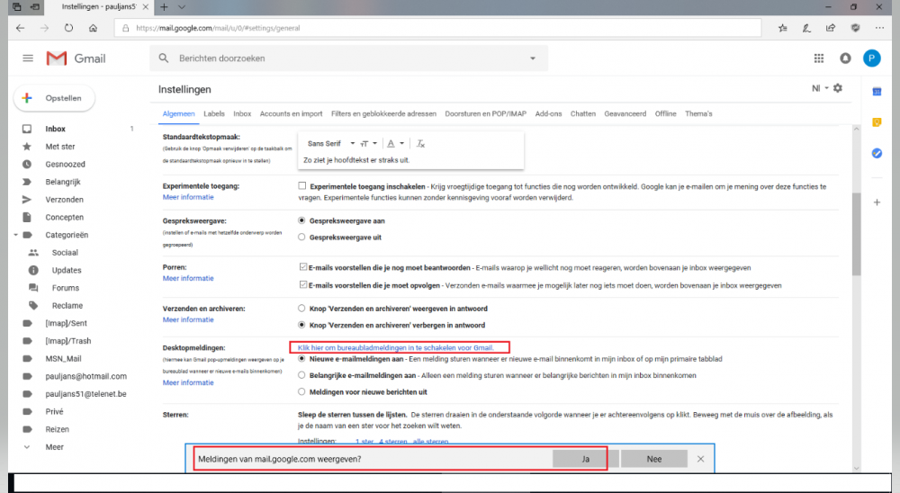 Alle mogelijke combinaties (Edge en Google) met deze suggesties getest. Nog steeds geen melding van een inkomende mail op mijn laptop scherm. vg, POL
