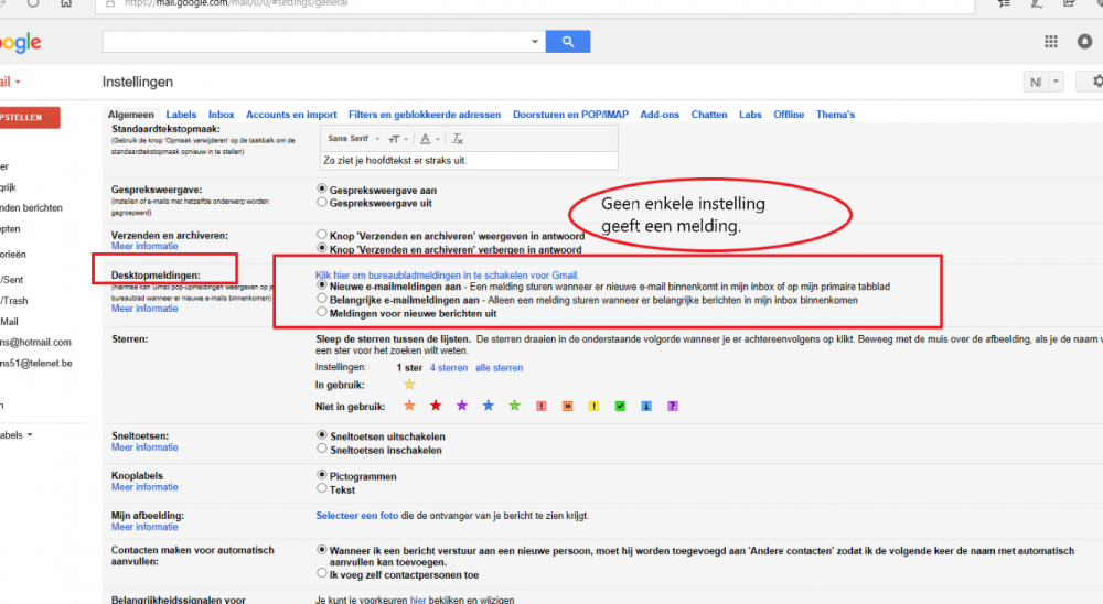 Beste Clarkie, Na enkele dagen mijn probleem te laten "rusten", vandaag weer "den draad" opgenomen. Als je bijna 70 bent, gaat dit niet meer zo vlot. Enfin , alle suggesties van jou nog een rustig doorgenomen. En ben er in geslaagd de email meldingen op het bureaublad te krijgen. Bedankt voor de hulp en u GEDULD. vg, Pol