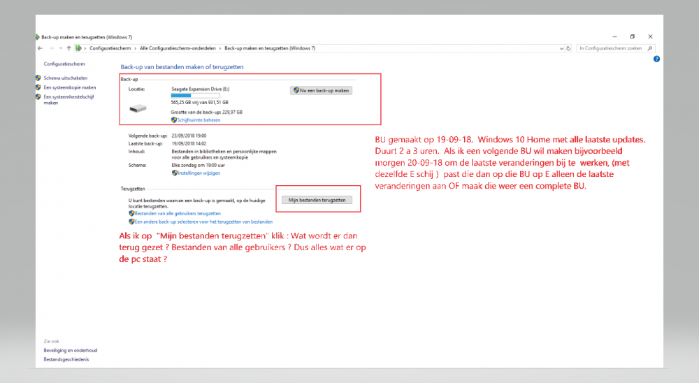 De E schijf is een externe 1tb schijf. Mijn vraag is meer bedoeld om op een simpele wijze een backup te maken op een extern medium van ALLES wat op de laptop staat. Als er dan problemen zijn, of ik bijvoorbeeld een nieuwe laptop koop via de usb bus ALLE programma's en bestanden daarop kan overzetten. Bij Microsoft slagen ze daar blijkbaar niet in. vg, Pol