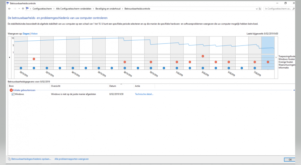Laptop Acer 2 jaar en 2 maanden oud. Alles up to date. In december 2018 (juist voor de garantie voorbij was) nieuwe hd en moederbord geplaatst onder waarborg. Sinds een aantal dagen gaat de laptop 1 X per dag in stop. Beeld en muis zijn " bevroren" . Moet dan de pc uitzetten (aan-uit knop) en terug opstarten. Zie printscreen. De probleemoplosser zegt dat alles ok is. Wat kan de oorzaak zijn ?
