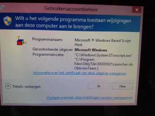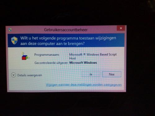 Hallo, dit is het bericht dat ik telkens krijg als ik mijn nieuwe laptop wil afsluiten, wie kan me zeggen wat dit precies betekent, ik moet op ja klikken of ik kan niet afsluiten, dit bericht verscheen nadat een collega van mij Obityle had gedownload om knoppen aan te maken in windows 8, als ik bij meer details klik, krijg ik ook te zien dat bij program files verwezen wordt naar die obityle, wie kan me in begrijpbare taal uitleggen wat die windows based script host te betekenen heeft, ik weet ook wel dat ik dit bericht eventueel kan weg krijgen door bij- wijzigen wanneer deze melding wordt weergegeven-, eventueel met schuivers te werken doch is dit veilig, want wordt niet aanbevolen om dit te doen en als ik de schuivers herzet, heeft dit betrekking op beveiliging van mijn laptop ? Of is het telkens opnieuw verschijnen van dit bericht een restant van virus of dergelijke mee binnen gehaald bij het downloaden ? Dank voor uw antwoord, Lola