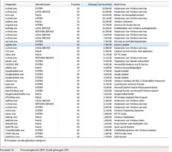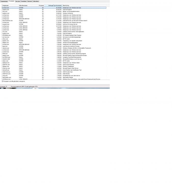 Wanneer ik de laptop opstart blijft de cpu minuten lang, tot bijna een uur, op 100 % draaien. Ik kan geen mediabestanden afspelen. Deze zijn traag, met horten en stoten, het geluid is robotachtig, .... Pas wanneer de CPU stilvalt, gaat alles normaal, en snel. Het is gewoon heel triestig om een uur te moeten wachten tot de PC goed werkt. Bijvoorbeeld Skype werkt ook enkel goed als de CPU niet meer aan 100 % draait. Het zijn vooral meerdere "svchost.exe" bestanden die de processor belasten.