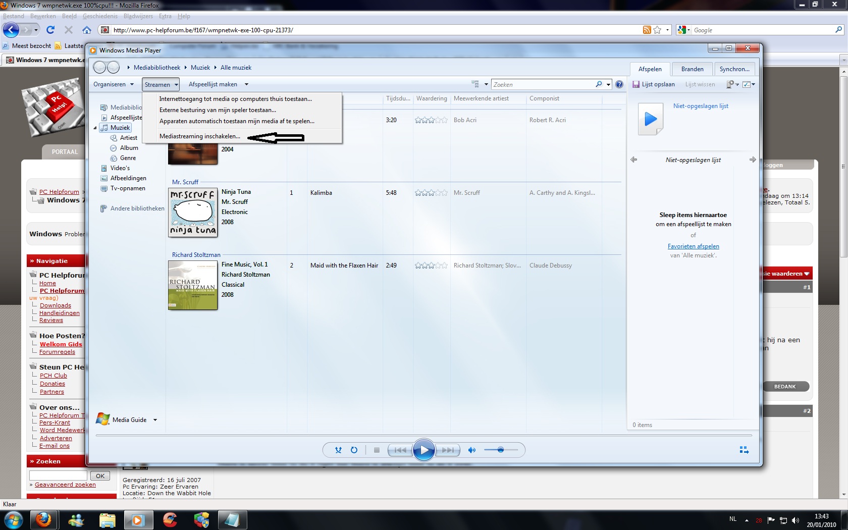 ik zie vanonder in mediaplayer:mediabibliotheek bijwerken.en volgens mij komt het hierdoor dat mijn cpu op 100% staat.als ik taakbeheer open,dan zie ik daar wmpnetwk.exe met 100% cpu.wanneer ik deze laat stilleggen.komt mijn cpu metteen tot rust!open ik opnieuw mediaplayer begint alles van vooraf aan.heb ook al via start en uitvoeren services.msc en dan mediaplayer uitgeschakeld(network sharing)maar durf ik mediaplayer openen begint het weer opnieuw!