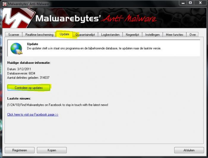 Start MBAM op, selecteer het tabblad 'update' en klik dan op 'Controleer op updates'.