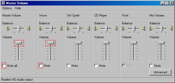 Wanneer je via configuratiescherm naar geluid navigeert, staan alle geluidniveaus op het maximum zoals in onderstaande afbeelding? Let er ook op dat nergens het vakje Mute is aangevinkt.