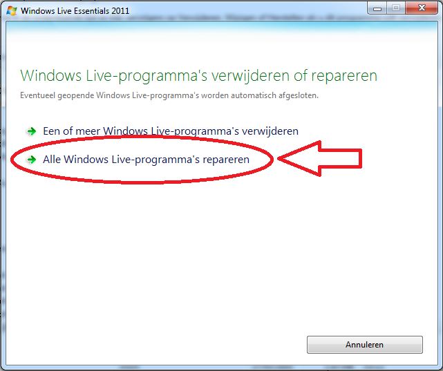 Zoek in deze lijst (alfabetisch) de Windows Live Essentials, klik er met rechts op en kies dan voor Alle Windows-live programma's repareren.