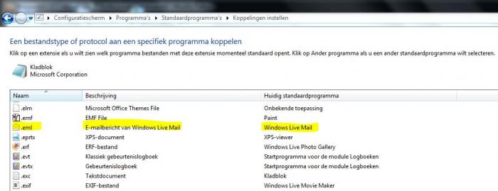 Het probleem is iets anders.Ik krijg met een E.mail een bijlage in een EML bestand,dat met Windows 7 in Windows live geopend moet worden? (Bij XP met Outlook express.)Daar gaat het fout,omdat ik ook bij Openen met: Niet aan Windows Live mail kan koppelen?Bij Standaard Programmas heb wel Windows Live achter het eml bestand staan.Maar bij Programma kiezen kan ik Windows Live,niet vinden en gekoppeld krijgen aan een EML bestand.