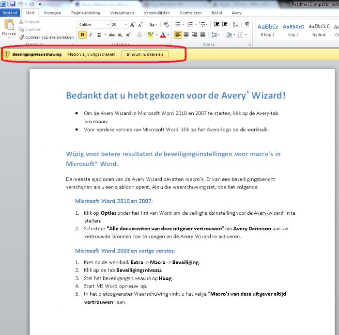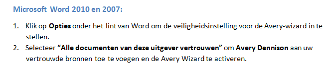 Nu heb ik al jouw stappen nog eens identiek nagedaan en bij de stap in Word, schakel ik de macro's in en die lijn verdwijnt dan gewoon maar... geen extra menu van avery te zien...