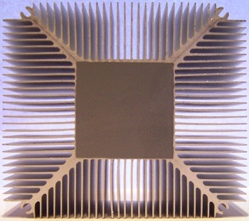 Mochten we een CPU met een koeler erop onder een microscoop gaan bekijken zou het er als volgt kunnen uitzien.