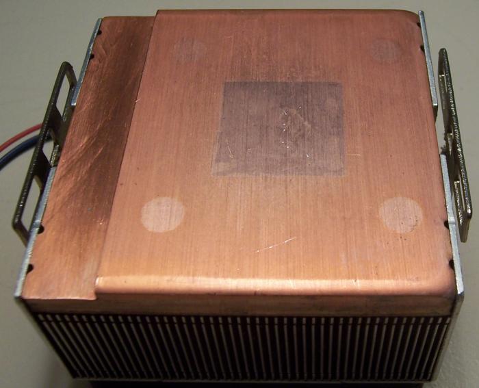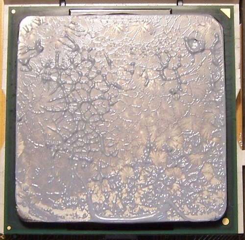 In de volgende afbeeldingen zie je oude koelpasta op een koelblok en CPU na demontage.