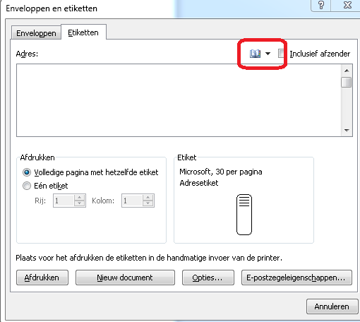 En het mooie is dat ik zo'n adressenbestand reeds heb. Maar wat ik niet weet is hoe ik deze adressen aan kan roepen in het "afzender" -icoontje in het enveloppen-venster van Word?